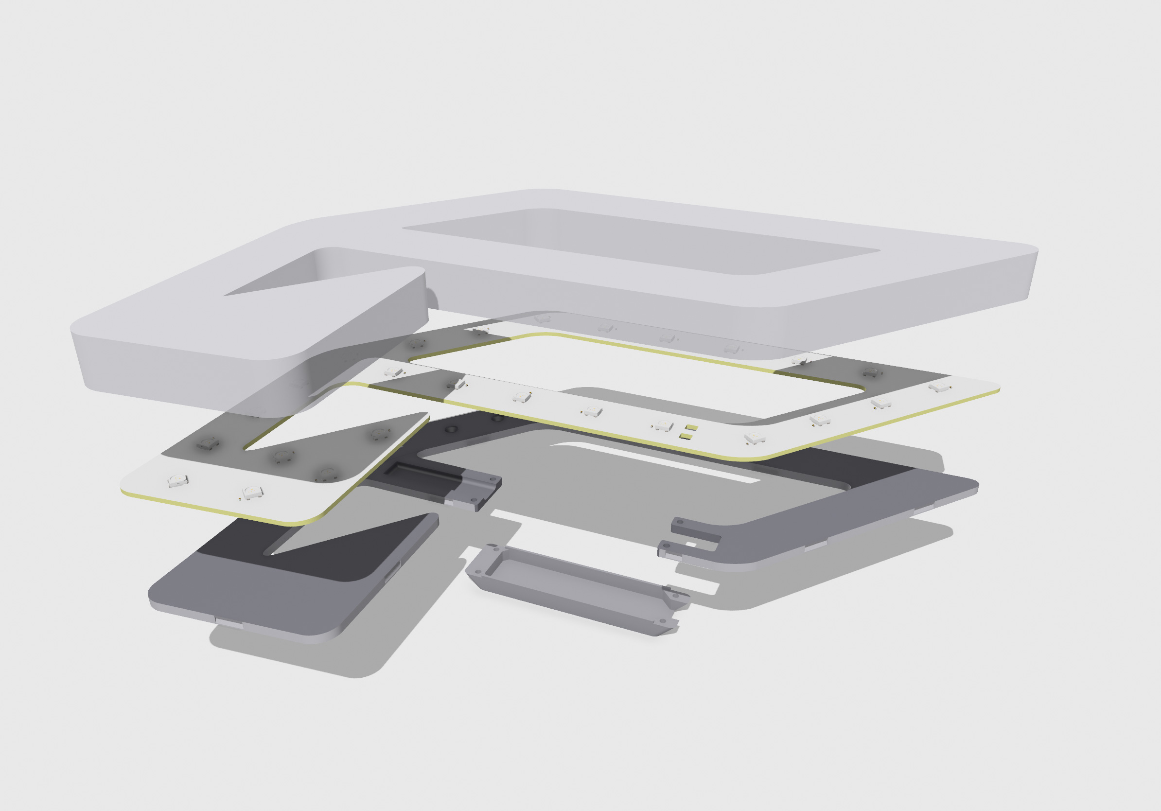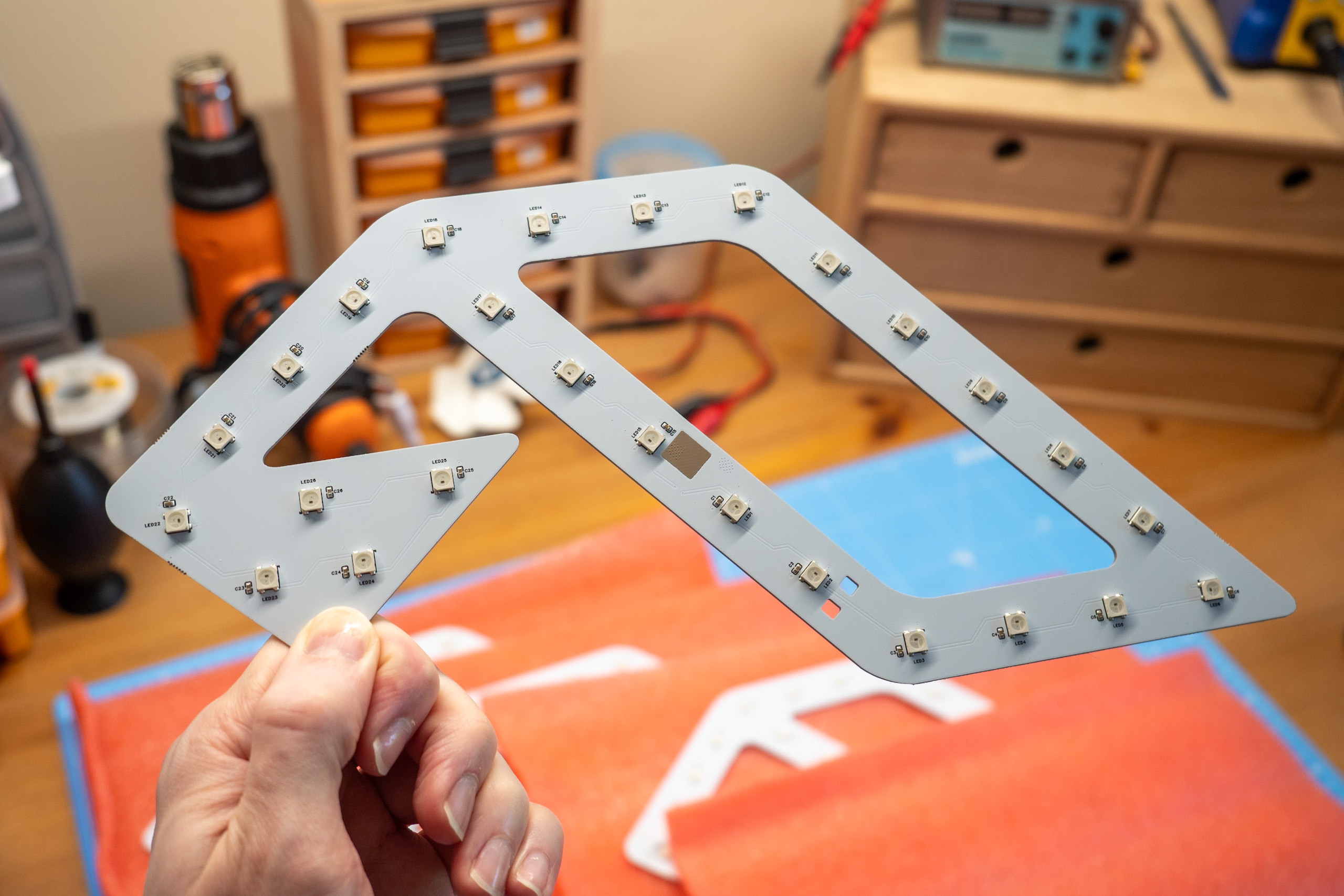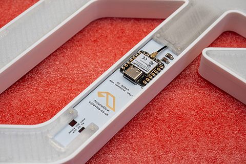 Custom PCB, snap-fit enclosure, magnetic cover, interchangeable mounting options with brass threaded inserts, <500mA power consumption for long powerbank runtime, WiFi control courtesy of WLED.
